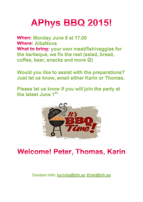 APhys BBQ Time: Mon 2015-06-08 17.00 Export to calendar Welcome to APhys BBQ! Please note the invitation (pdf 163 kB) . To the calendar