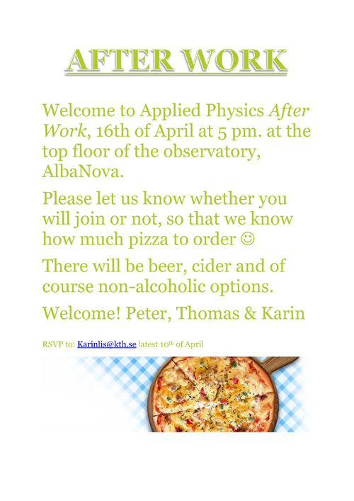 Welcome to join Applied Physics first official After Work ever! Please note the invitation (pdf 286 kB) !